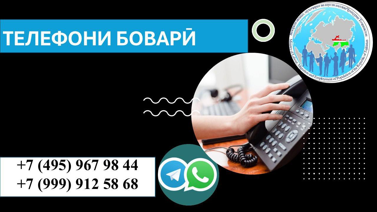 Намояндагии Вазорати меҳнат, муҳоҷират ва шуғли аҳолии Ҷумҳурии Тоҷикистон дар Федератсияи Россия оид ба муҳоҷират иттилоъ медиҳад, ки барои шаҳрвандони Ҷумҳурии Тоҷикистон дар Федератсияи Россия телефони боварии Намояндагӣ +7(495)9679844 фаъолият дорад, ки шаҳрвандон метавонанд вобаста ба ҳалли мушкилоташон муроҷиат намоянд.